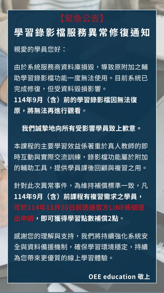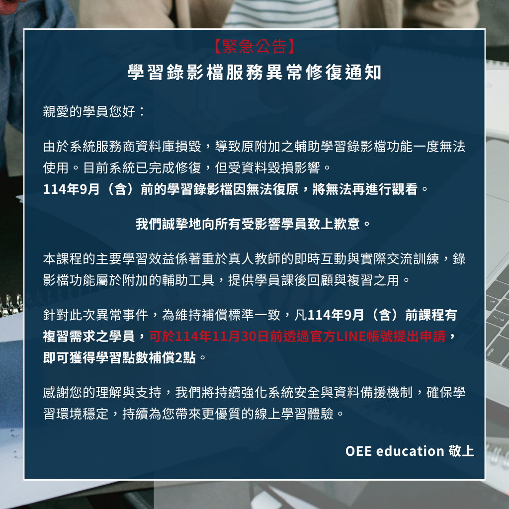 OEE全體核心共識:學習成果至上,我們致力排除無效的學習內容與授課方式,專注學習者的成長歷程,提供最正確、最有效的教學服務,將所有努力轉化為看得見的成果。