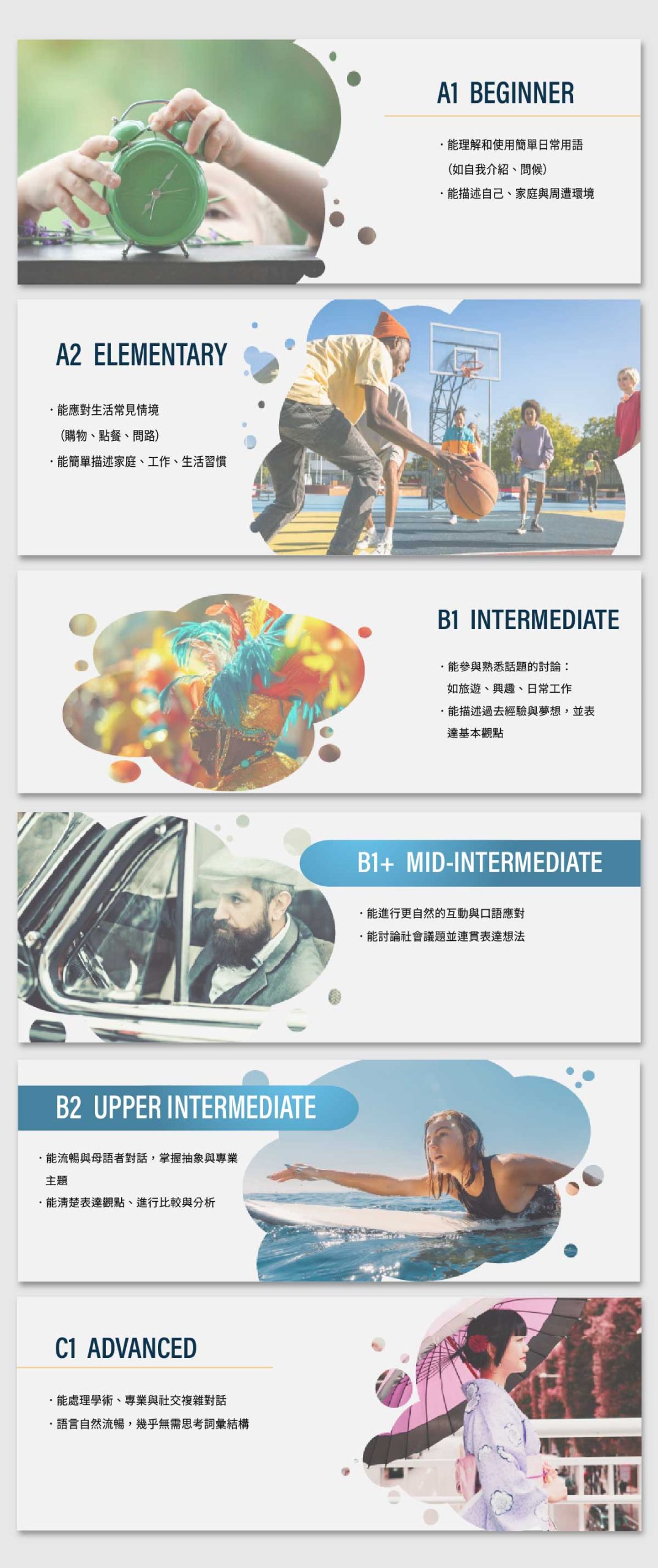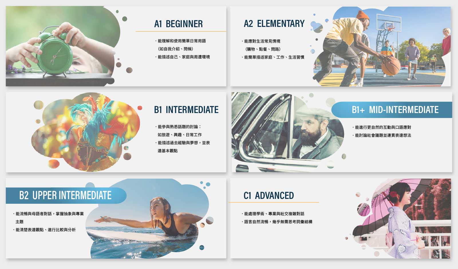 OEE EDUCATION Essential必修語言技能課 Essential 必修語言技能課 使用Oxford Wide Angle教材,精準定向學習策略,課程強調實用性與專業性,助你在職場、學術等領域中游刃有餘,並積累高階語彙與表達技巧,提升語言流暢度與自信。 運用 Oxford Wide Angle,精準定向學習策略,系統強化聽說讀寫,穩步進階流利英語,輕鬆駕馭各類語境,從容應對多元挑戰。OEE education 與 Oxford 合作打造的 Essential 必修語言技能課,幫助你精進聽、說、讀、寫四大技能,輕鬆應對各類語境挑戰。使用 Oxford Wide Angle 教材,課程強調實用性與專業性,助你在職場、學術等領域中游刃有餘,並積累高階語彙與表達技巧,提升語言流暢度與自信。 使用Oxford Wide Angle教材,精準定向學習策略,課程強調實用性與專業性,助你在職場、學術等領域中游刃有餘,並積累高階語彙與表達技巧,提升語言流暢度與自信。 Essential 縱向發展打穩語言地基 學習不是一蹴可幾,需要科學的規劃與持續努力,我們專業團隊會根據您的語言水平和學習進度,為您量身設計一份個性化的學習計劃,保證每一步都朝著目標邁進。 REAL WORLD RELEVANCE 真實世界為導向的主題設計 單元主題來自真實情境與跨文化議題,如:創新科技、社會趨勢、職場互動等。 有助於學生在課堂之外立即應用語言,培養跨文化溝通能力。 21st Century Skills 強調21世紀核心技能 融合批判思考、合作、數位素養與媒體理解能力的任務式學習。 特別適合培養學生在學術或職場上的思辨與表達力。 Visual Literacy 視覺引導學習 幫助學生從視覺素材中推論語意、練習表達,強化輸入與輸出之間的連結。 Task-Based Learning 任務導向式學習 每單元以「Real-World Goal」為導向設計學習任務(如撰寫建議、發表意見、完成討論等)。 讓學習不只是文法與單字,而是圍繞實際可完成的語言任務展開。 Integrated Language Focus 語言點自然融入情境中 文法、詞彙、發音等語言重點不單獨教學,而是置入溝通任務與主題對話之中,更自然。 有效提升學生在情境中掌握語言的能力,而非死記硬背。 A Structured and Purposeful Curriculum Framework 結構化設計的課程架構 A Structured and Purposeful Curriculum Framework 每堂課涵蓋以下技能 閱讀 精選文章與主題,培養您對不同文體的理解與分析能力。 聽力 透過真實語境對話與聽力練習,幫助您提升理解速度和反應能力 口說 以實際情境演練和互動討論,促進流暢且自然的英語表達。 寫作 從基礎句型到進階段落結構,逐步提高寫作技巧和邏輯表達能力。 文法 精選文章與主題,培養您對不同文體的理解與分析能力。 字彙 有計劃地擴充常用及專業詞彙,全面提升您的語言運用水準。 閱讀 精選文章與主題,培養您對不同文體的理解與分析能力。 聽力 透過真實語境對話與聽力練習,幫助您提升理解速度和反應能力。 口說 以實際情境演練和互動討論,促進流暢且自然的英語表達。 寫作 從基礎句型到進階段落結構,逐步提高寫作技巧和邏輯表達能力。 文法 系統講解英文語法,鞏固語言基礎,讓您運用更得心應手。 字彙 有計劃地擴充常用及專業詞彙,全面提升您的語言運用水準。 免費體驗課程 Please enable JavaScript in your browser to complete this form.Please enable JavaScript in your browser to complete this form.Email *預計體驗課程時間平日白天(13:00-18:00)平日晚上(18:00-22:00)假日白天(13:00-18:00)假日晚上(18:00-22:00)Comment預約體驗 預約體驗 上課方式 1 對 1|50 分鐘 目的:讓老師根據你個人程度與進度,一層一層打穩語言基礎 內容設計:系統性學習詞彙、句型、文法結構練習聽力、口說、閱讀與寫作四大技能教務追蹤個人學習進度,確保連貫與持續累積 成效:幫你把「英文大樓」一層一層蓋穩,結構清楚、基礎穩固 開課時間 天天開課,隨時都能加入學習 09:00-17:0019:00-22:00 課程預定規則 24小時前完成訂課:確保您能準時參加課程,享有最佳學習體驗最晚12小時前取消課程:若需更改課程時間,請提前通知我們 上課方式 1 對 1|50 分鐘 目的:讓老師根據你個人程度與進度,一層一層打穩語言基礎 內容設計:系統性學習詞彙、句型、文法結構練習聽力、口說、閱讀與寫作四大技能教務追蹤個人學習進度,確保連貫與持續累積 成效:幫你把「英文大樓」一層一層蓋穩,結構清楚、基礎穩固 開課時間 天天開課,隨時都能加入學習 09:00-17:0019:00-22:00 課程預定規則 24小時前完成訂課:確保您能準時參加課程,享有最佳學習體驗。最晚12小時前取消課程:若需更改課程時間,請提前通知我們。 免費體驗課程 Please enable JavaScript in your browser to complete this form.Please enable JavaScript in your browser to complete this form.Email *預計體驗課程時間平日白天(13:00-18:00)平日晚上(18:00-22:00)假日白天(13:00-18:00)假日晚上(18:00-22:00)Message預約體驗 預約體驗 免費課程